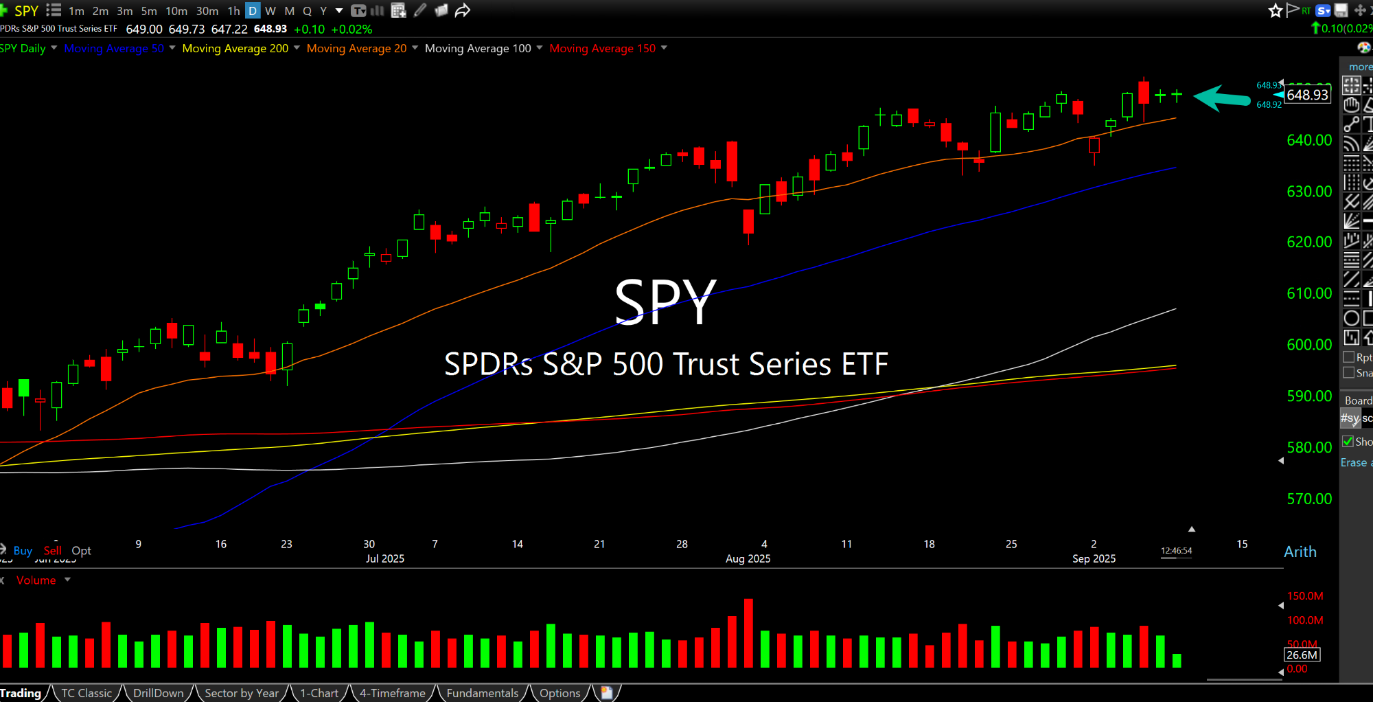 As you can see on the updated SPY (ETF for the S&P 500 Index) daily chart, below, the arrow points to today's candle, thus far.