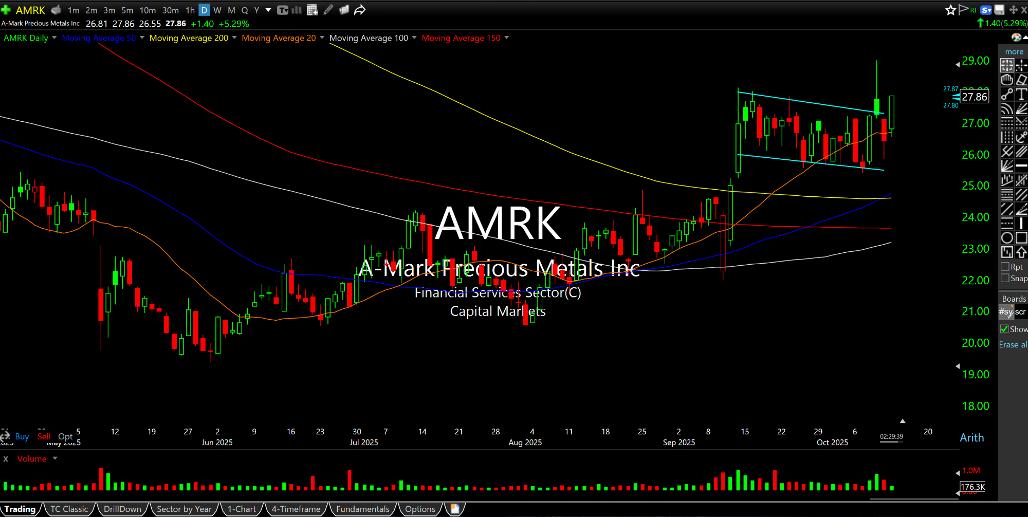 A-Mark Precious Metals (Ticker AMRK, founded in 1965 as A Mark Coin Company, and seen on the first daily chart, below) is a precious metals trading company. It was the first company allowed to make and sell coins from the metals recovered in the shipwreck of SS Gairsoppa.