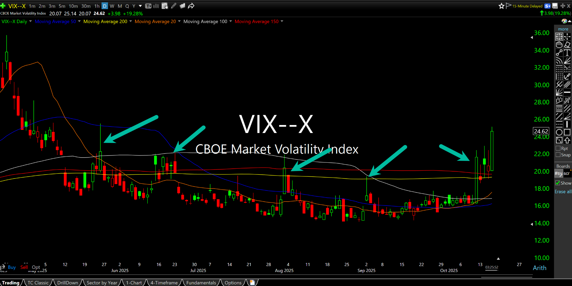 Beyond that, and perhaps of the utmost importance, the spike above VIX did not immediately come crashing down into the mid-teens like so many times before. Instead, the VIX regained its footing quickly and is shooting higher yet today, as seen on the updated daily VIX chat, below, during this final hour of trading.