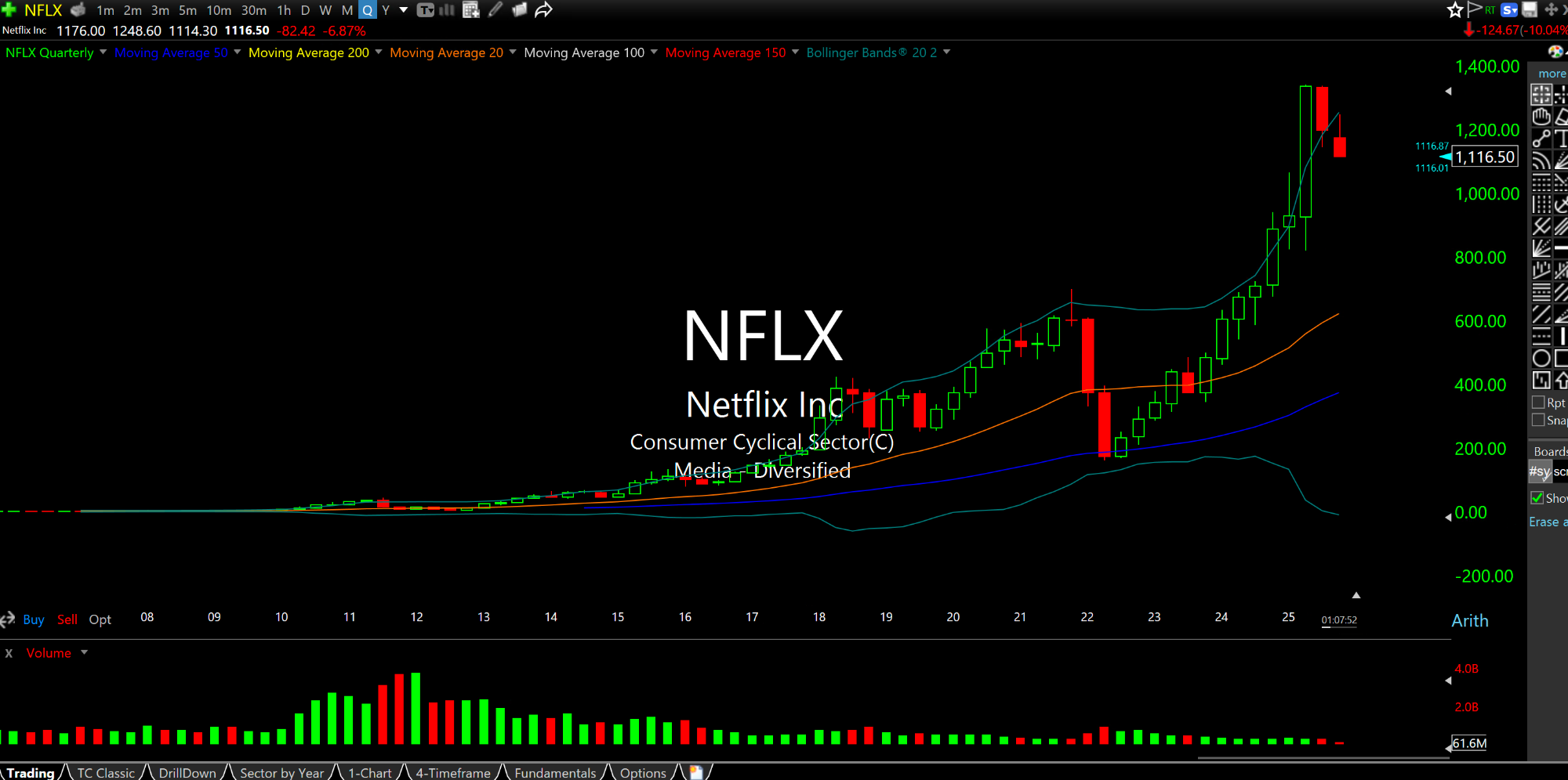 At the same time, the quarterly chart of Netflix, updated below, is still instructive to track as a litmus test for some of the most absurd multi-year steep uptrends out there. Unless this time is different, history tells us that these abnormally steep trends unravel violently, particularly after a protracted melt-up like this has been.