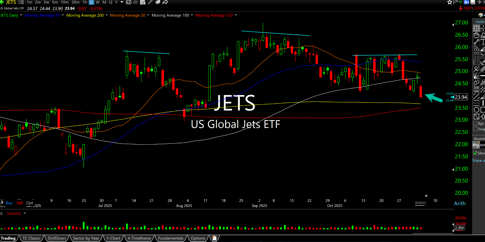 In addition, I am flabbergasted that the airlines have held up as long as they have. On the JETS sector ETF daily chart, below, you can see a multi-month topping pattern in play with notable weakness today taking price down to levels not seen since early-August. Clearly, the historic length of the government shutdown is adversely affecting airlines, particularly with Thanksgiving coming up.