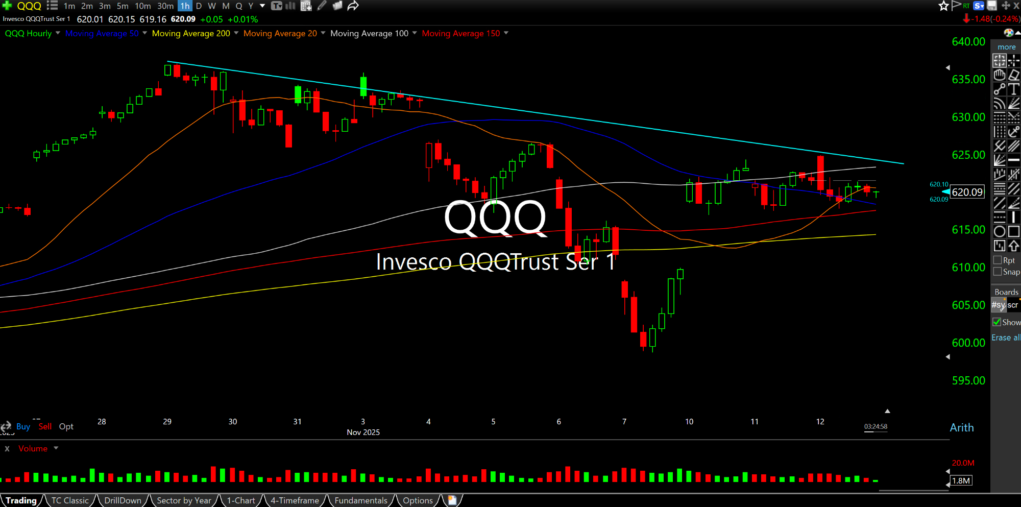 The updated chart, below, of the QQQ ETF, on the hourly timeframe dating back to the October 29th highs exactly two weeks ago, pretty much sums up where the Nasdaq is at the moment. We have a corrective structure in the near-term, with bulls arguing this is but a mere blip before an inevitable end-of-year melt-up, while bears counter that every major top necessarily begins with a seemingly benign short-term top like this one. NVDA earnings are not for another week, and the White House confirmed today that we should pretty much not except any major economic data releases for the time being.