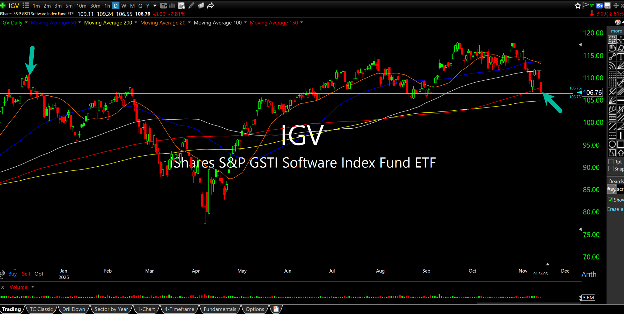 On the IGV ETF daily chart, below, the software sector is back below its 2024 highs (left arrow). After a recent weak bounce, the risk is now of a major breakdown on a multi-quarter basis.