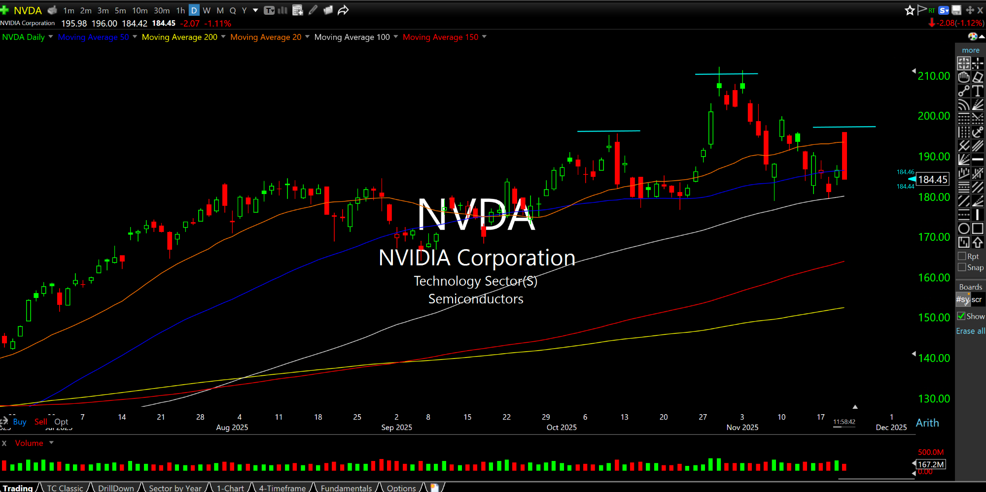 In my nightly full market recap video for Members last evening I noted the $195.60 area (the highs from early-October) for NVDA would likely be the battleground today. And thus far bears seem to be prevailing. Also note if the $195.60 area holds as firm resistance now we have the makings of a bearish head and shoulders top, which I have highlighted in light blue.