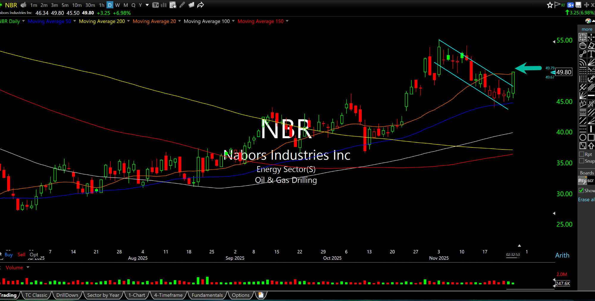 As slippery and untrustworthy as oil has been, you cannot deny the moxie, grit, and underlying bid that the oil services and equipment stocks in the OIH ETF have showing for a while now. Case in point: Even with crude having a soft session (but rallying off the session lows as we speak in the USO ETF) NBR (below on the daily chart) is one of many oil services green and continuing to sport impressive technicals.