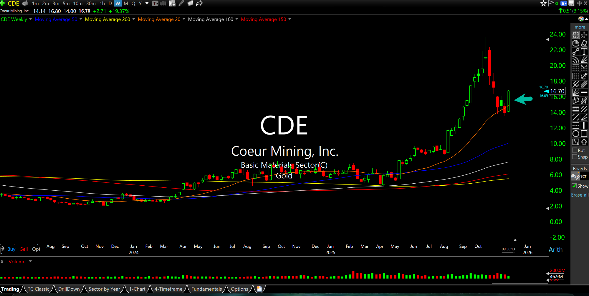 Regarding fresh ideas, keep an eye on catch-up precious miners like Coeur, below on the weekly chart bouncing hard off its 20-period weekly moving average after the October correction.