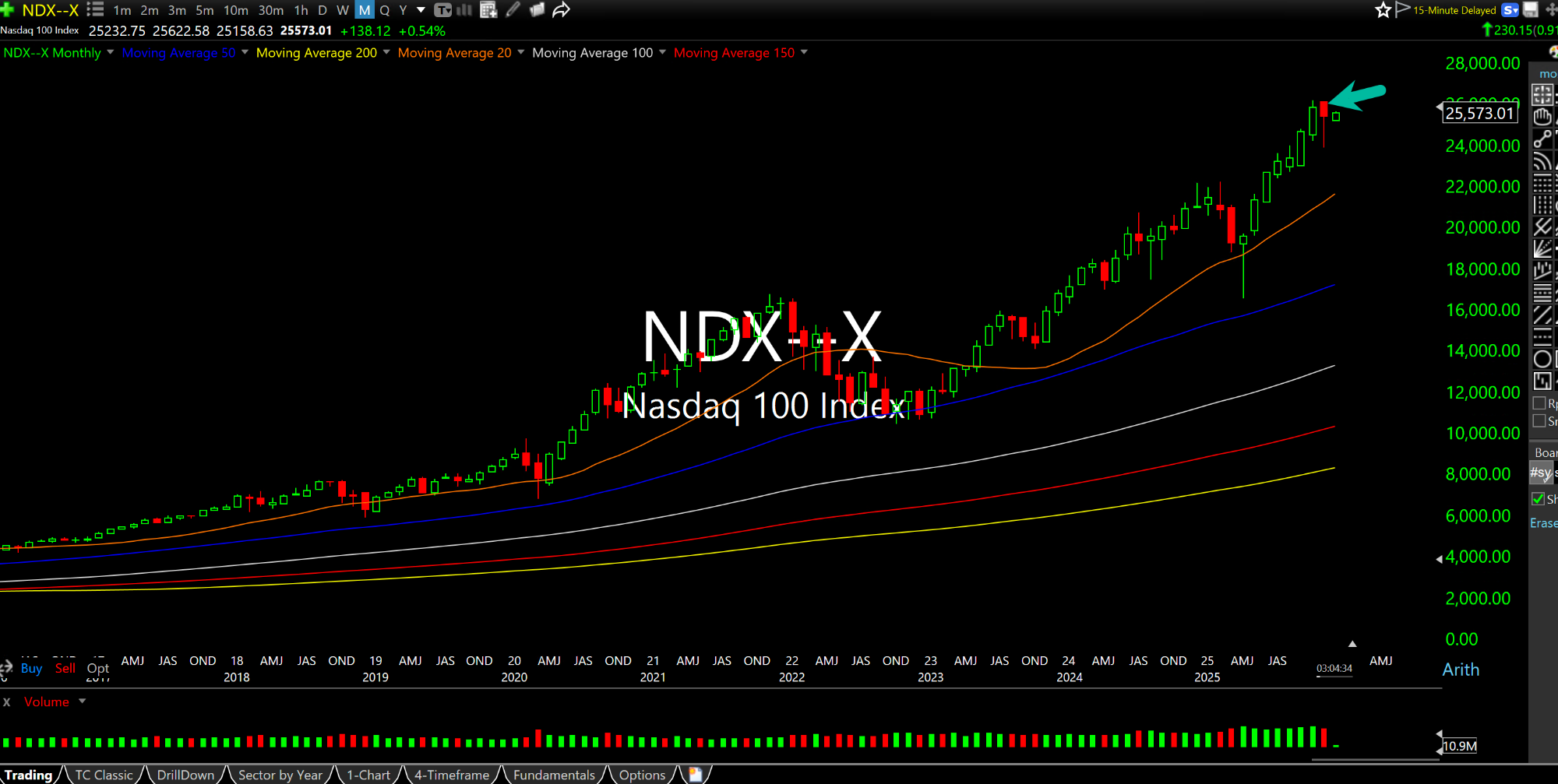 Inversely, the second monthly chart for the Nasdaq-100 Index shows us November's now-competed candle (arrow) is a potential bearish "hanging man" reversal. After a prior downtrend this same candle would be called a bullish "hammer." Alas, location, location, location, since it is now occurring after an epic muti-month winning streak for the index.