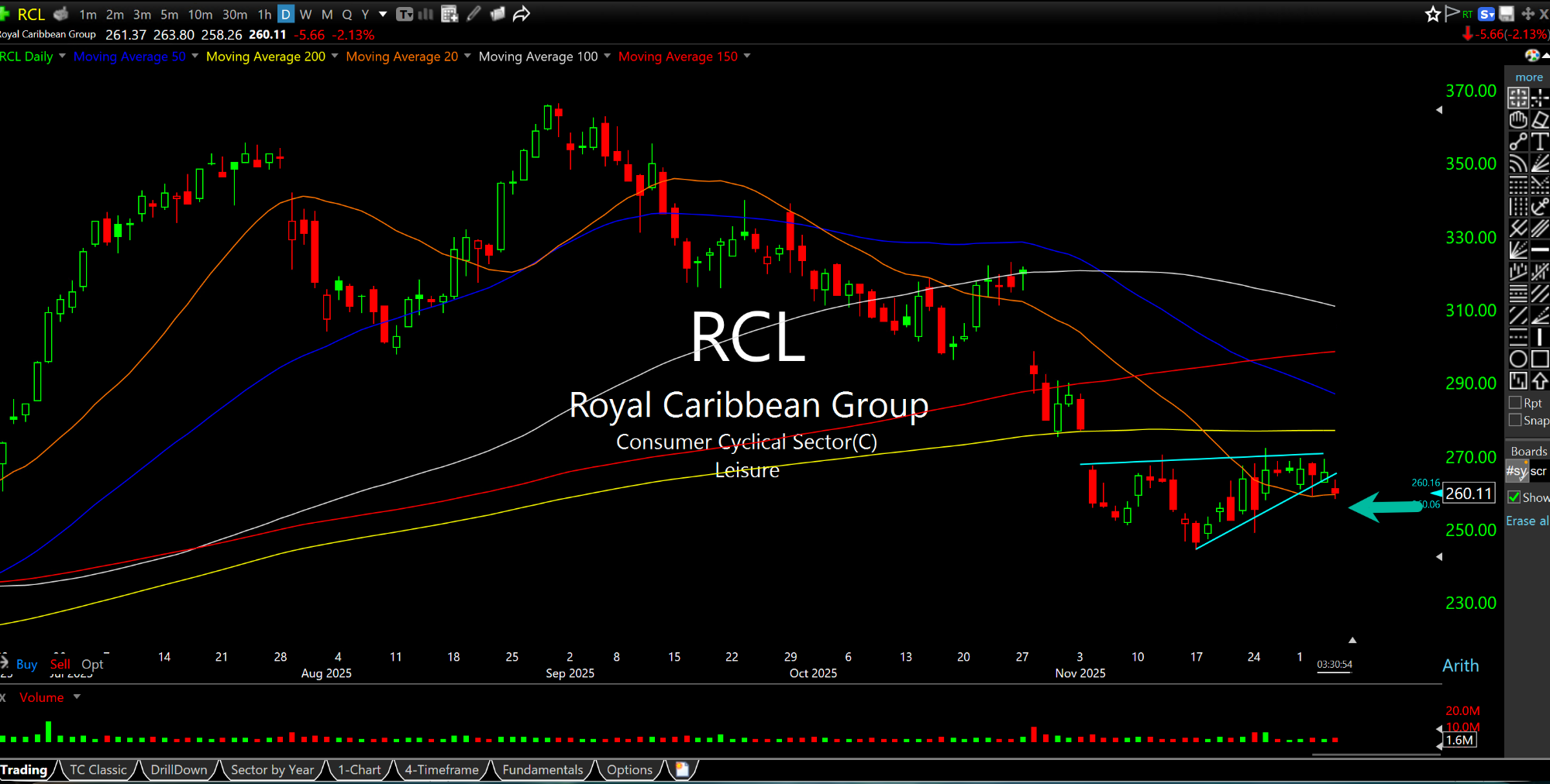 On the Royal Caribbean daily chart, updated below, we have a bear flag below the 200-day moving average, with CCL NCLH sporting similar looks. In other words, the downturn since Labor Day figures to have more legs lower.