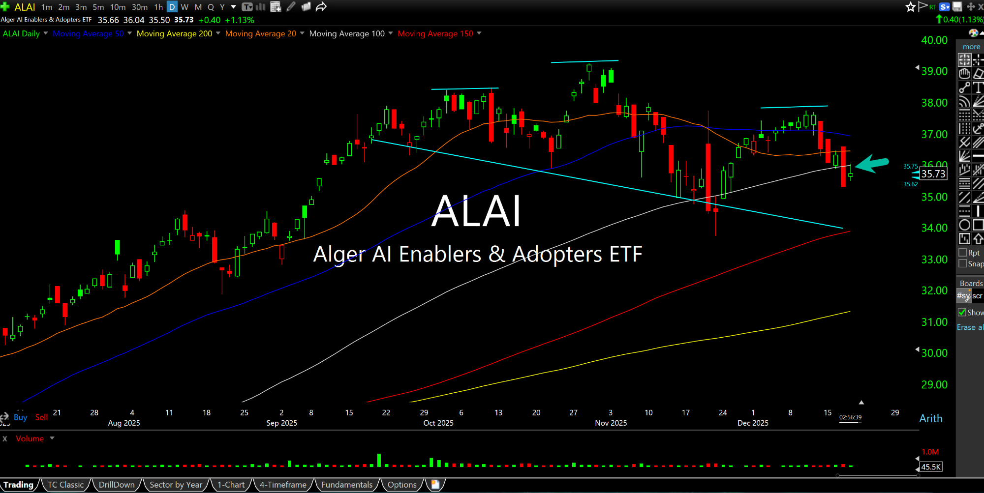 The Alger AI Enablers & Adopters ETF (ALAI), below on the daily chart, is composed of fifty-seven holdings, with the heaviest weights naturally assigned to AI monsters and market leaders like NVDA MSFT AMZN APP META GOOG and TSM.