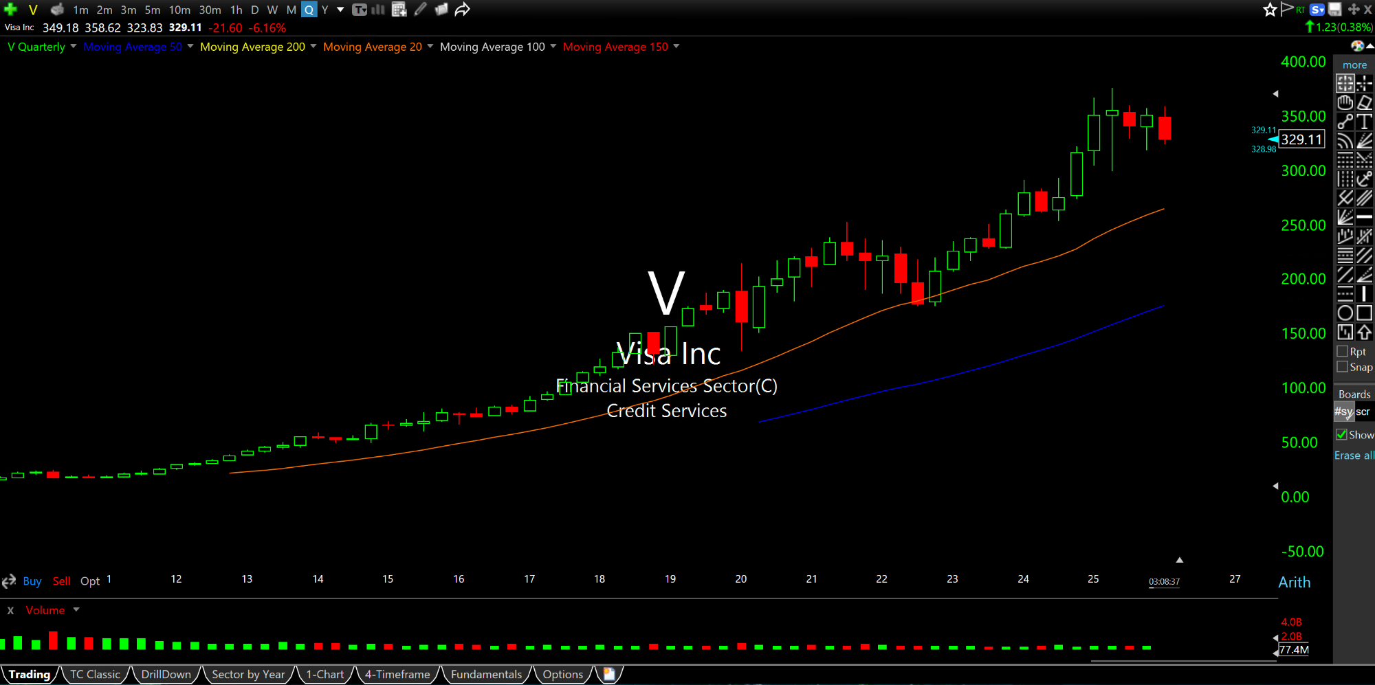 But even if that argument fails, the second point is that both MA and V have enjoyed seemingly nonstop, fifteen year rip-roaring rallies, as those quarterly charts illustrate, below.
