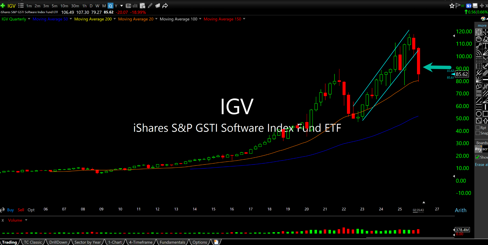 On the IGV quarterly chart, below, you can see this January/early-February downdraft breached a steep rising channel since 2022. As expensive as many software names were (and still are) the case for buying value still seems like a reach. Thus, what bulls are truly betting on is simply a resumption of the status quo.