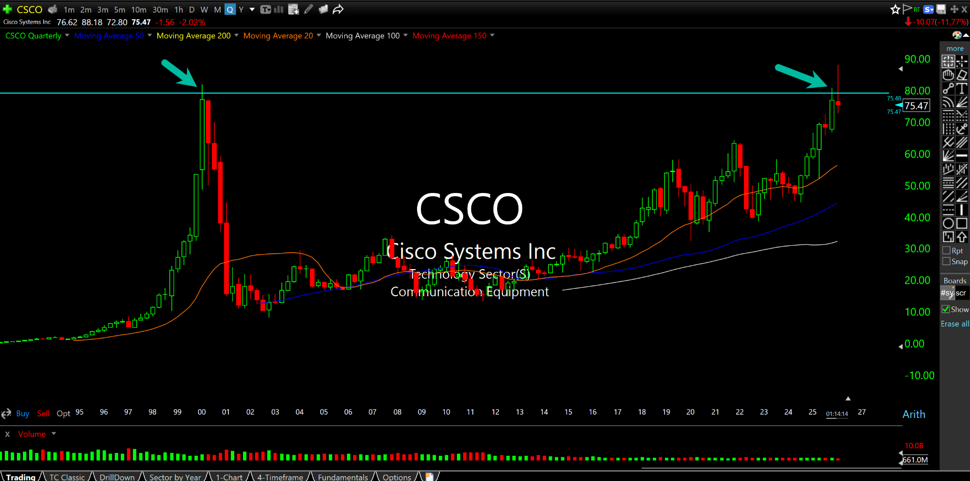 The star of the dot-com bubble was Cisco, updated below on the quarterly chart. After earnings, CSCO is selling off today on the back of pressure from memory chip pricing.