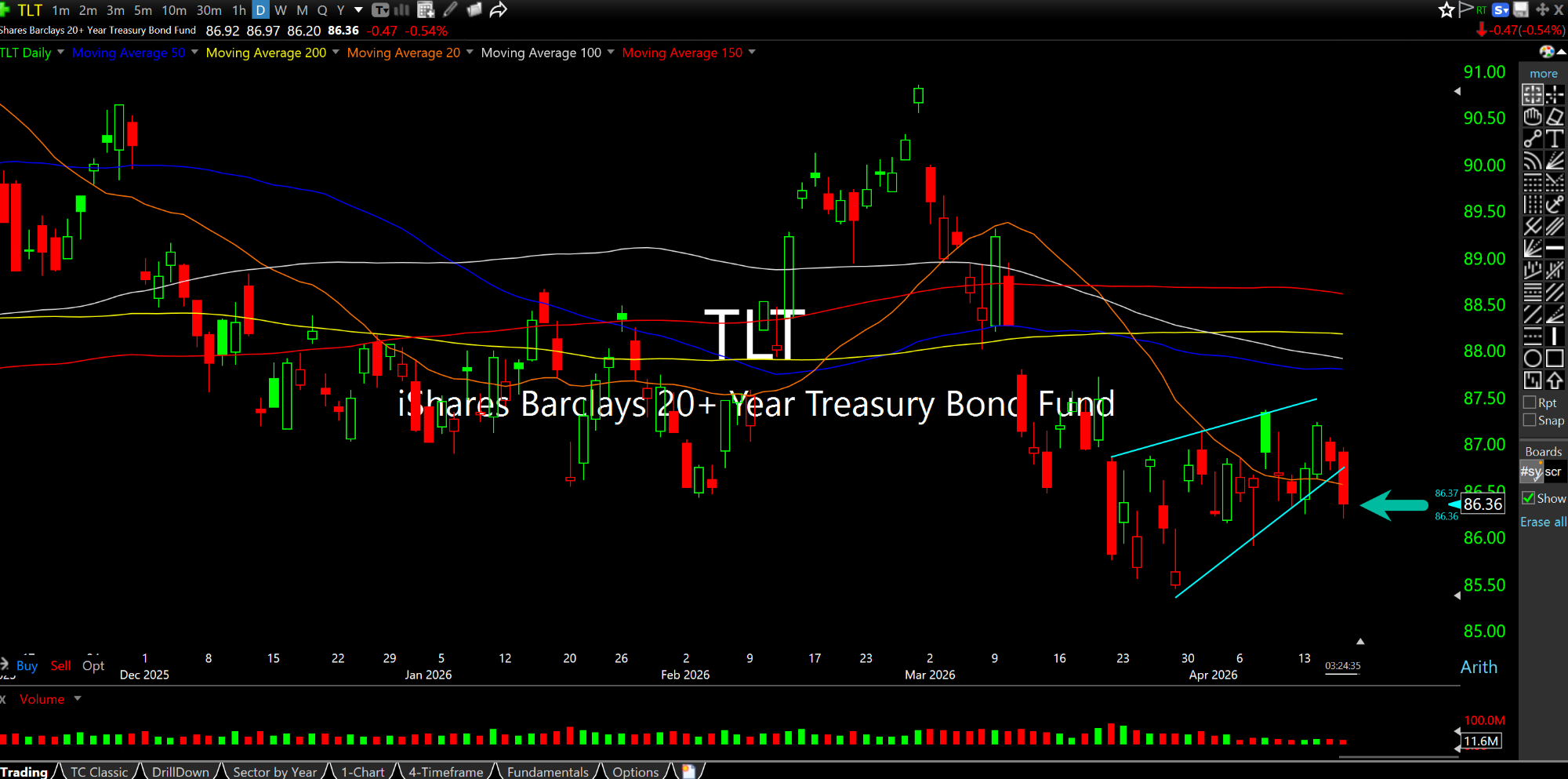 As you know, I continue to be a multi-year bond bear, which means I expect higher rates. TLT is an ETF essentially reflecting prices on the longer end of the curve, tracking inversely to rates.