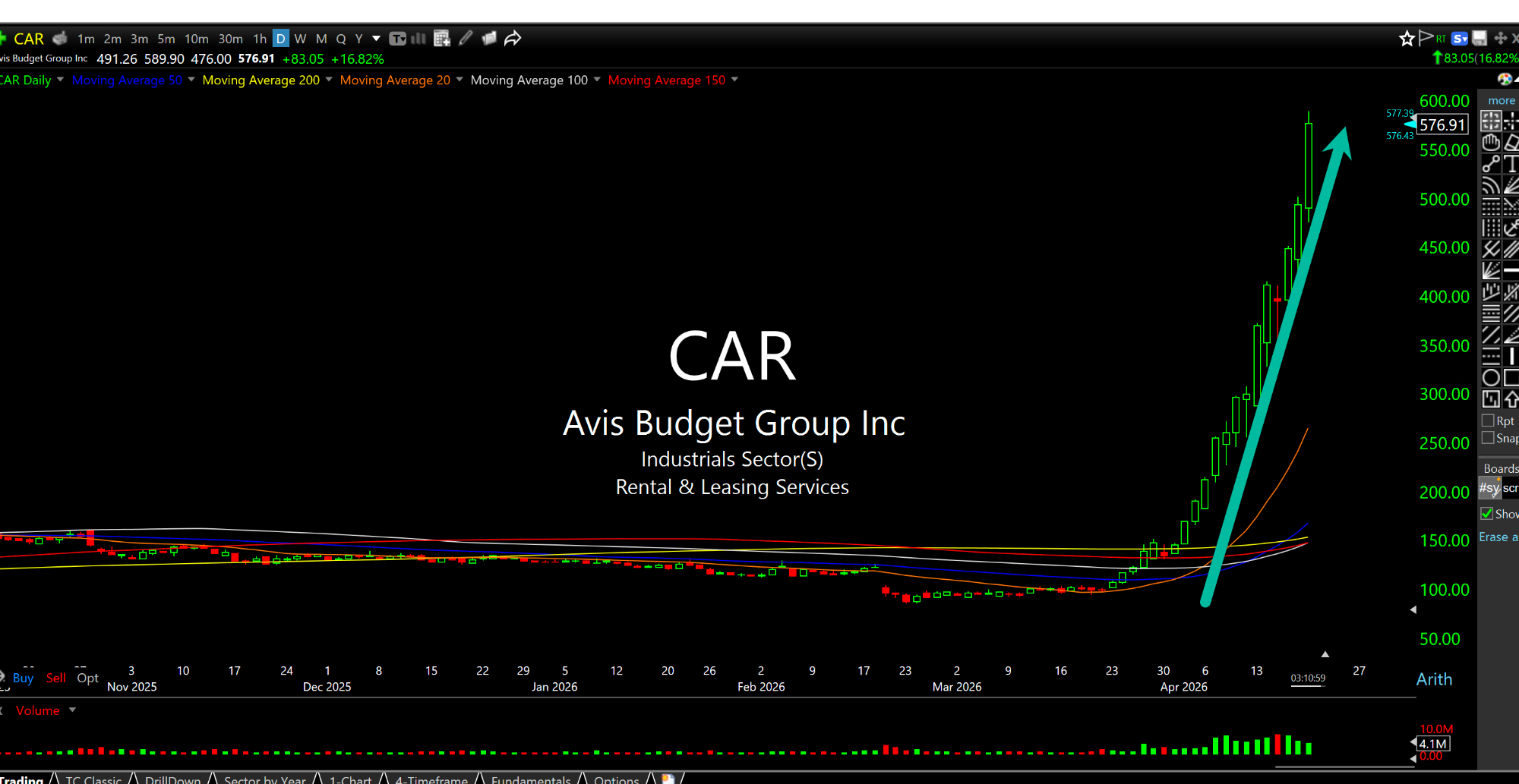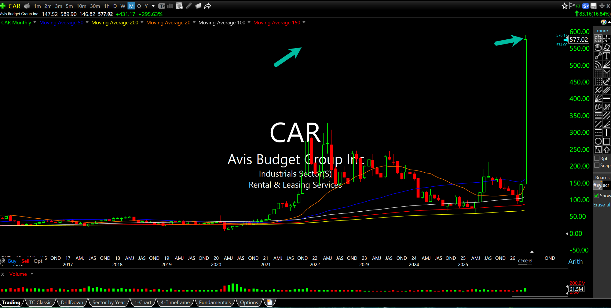 But we also have Avis, first below on the daily chart. The car rental firm announced they were leveraging AI to transform into a "mobility company," and the stock squeezed the 26% short float relentlessly, with overkill today. Beyond that, the monthly chart, second below, shows us we actually saw a similar squeeze back in 2021. If you needed evidence that rate hikes are appropriate, this one chart could suffice.