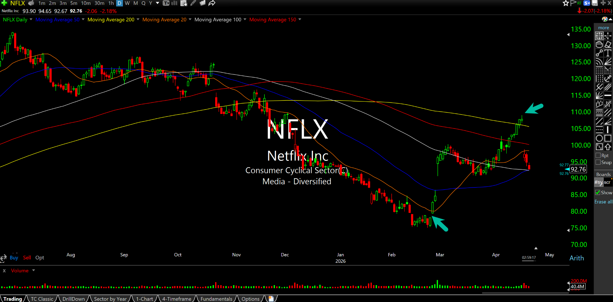 Specifically, NFLX (below on the updated daily chart) rallied hard into earnings only to sell off after the report. This was a classic, "buy the rumor, sell the news," reaction, which may be in store for the multitude of names which surged in recent weeks given the record-breaking (or rivaling) broad market rally.