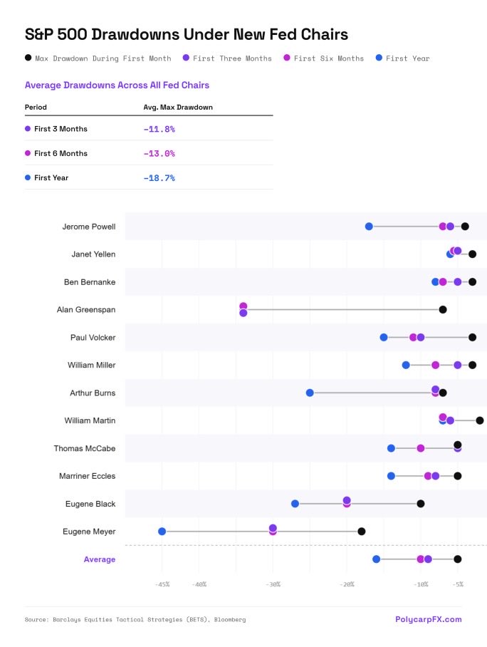 With Jerome Powell's term as Chair of the Federal Reserve expiring on May 15th, roughly two and a half weeks from now, it is instructive to examine prior instances of new Fed Chairs coming into power and how markets have reacted.